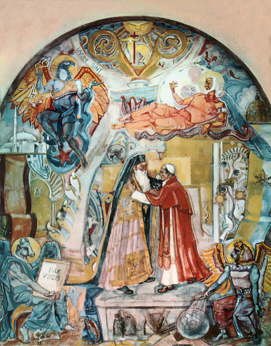 Au centre, le pape Paul VI et le Patriarche Athénagoras s'embrassent. Leur baiser symbolise l'unité de l'Eglise d'Occident et de l'Eglise d'Orient. Toutes deux sont représentées à droite, par le dome de Saint Pierre de Rome, et à gauche par une vue de Jérusalem.