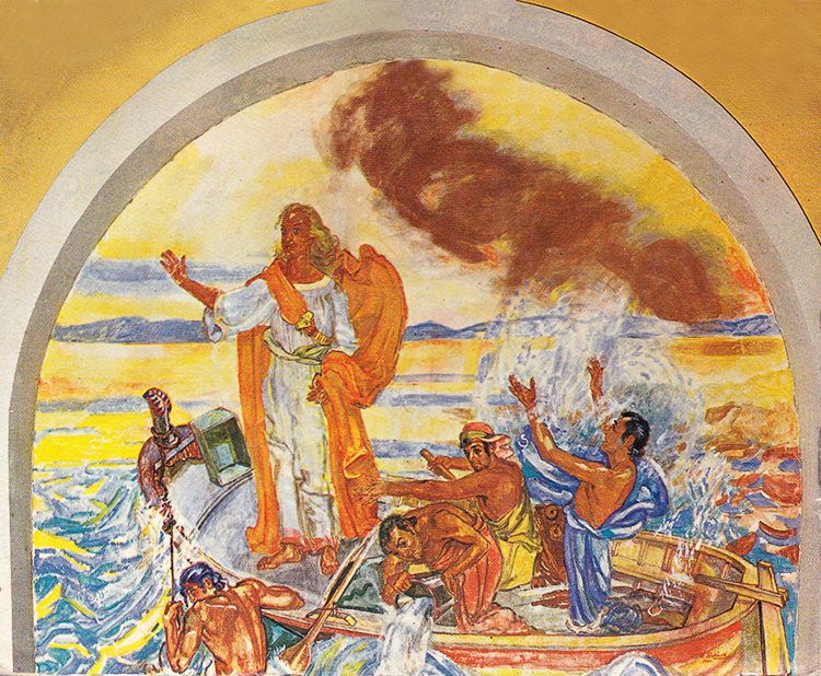 La tempête apaisée, peinte dans la sacristie est la première œuvre réalisée (10m2). Au delà de la simple représentation d'un moment de l'histoire biblique, cette composition est un prétexte à l'élaboration de magnifiques portraits du père Henry.